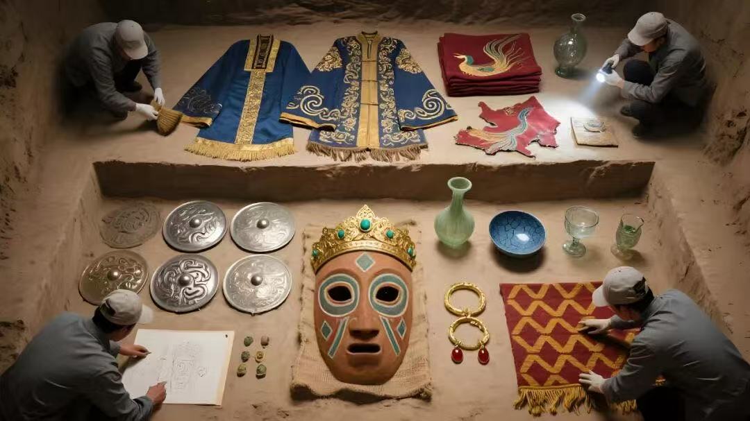 1995年发现的位于楼兰西北的营盘古墓,是罗布泊地区100年来发掘面积最大、文化内涵最为丰富的一处墓地。仅在15号墓里,就出土了汉晋时代的绢、缣、绮、丝绣、织金锦、汉代铜镜等,也有中亚艺术风格的麻质面具、黄金冠饰、金耳环、金戒指、波斯安息王朝的玻璃器具和艺术品,乃至希腊、罗马艺术风格的各类毛纺织品都可见到,真可谓尽收天下宝物。