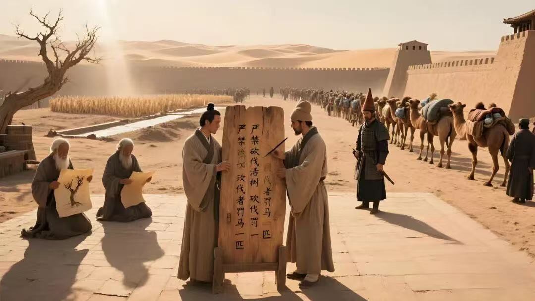 事实上,砍林伐木、破坏环境的恶果,楼兰人不是没有意识到。出自楼兰荒原的一件佉卢文木简上,就规定"绝不能砍伐小树","严禁砍伐活树,砍伐者罚马一匹"。但是,为时已晚,当时的楼兰,已经是丝绸之路上的重镇,人口密度大,过境商业繁荣,这对楼兰沙漠田的农业生产来说,负担实在是太重了。